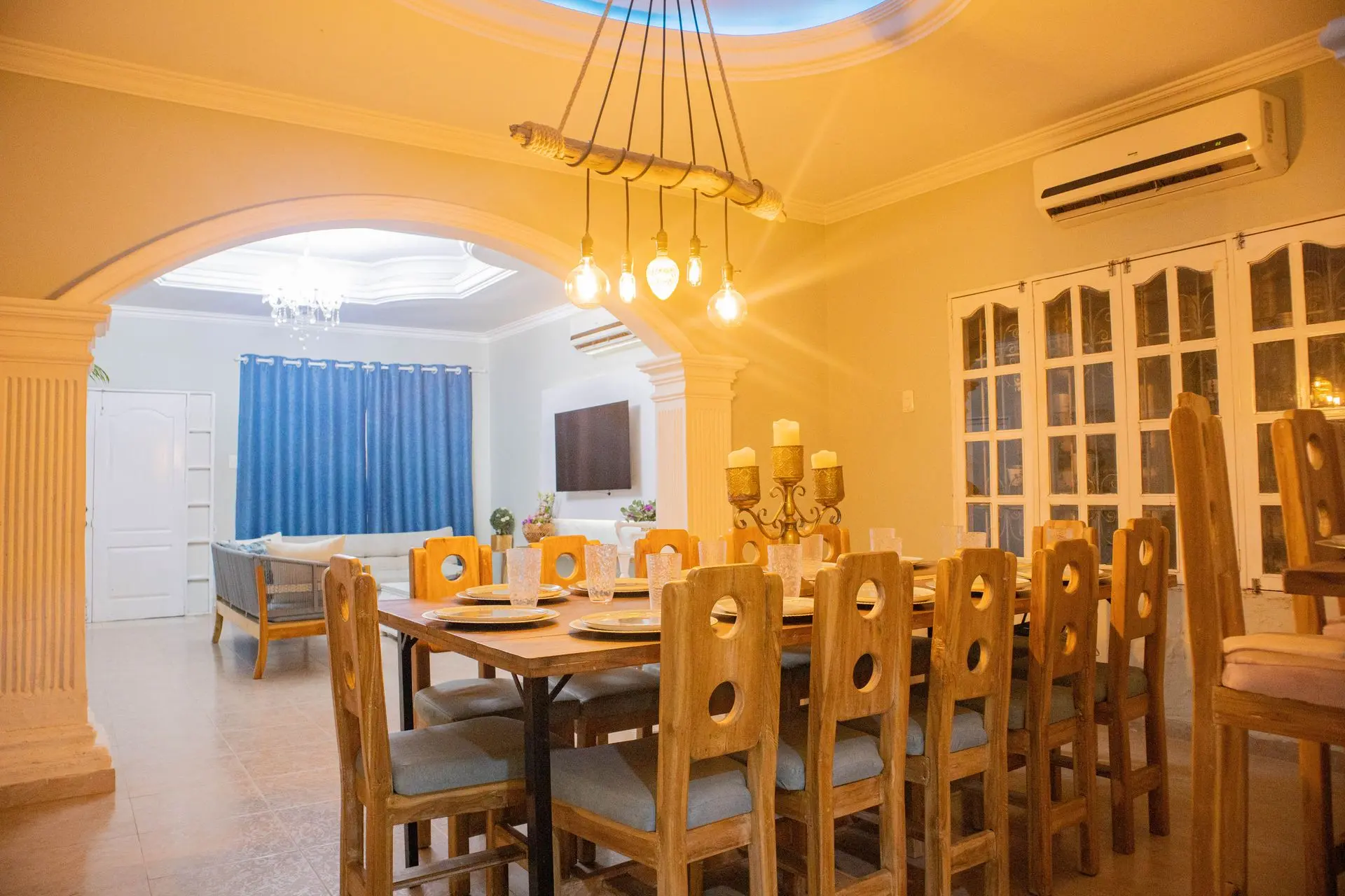 Sala amplia con aire acondicionado, un espacio para compartir como en casa, viendo la tele, escuchando música o compartiendo en el comedor, alrededor de una mesa de 16 puestos.